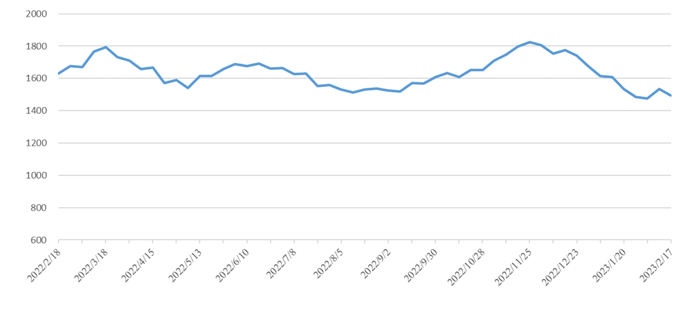 內(nèi)貿(mào)集運指數(shù)小幅回調(diào),本期(2023年2月11日至2月17日)中國內(nèi)貿(mào)集裝箱運價指數(shù)(XH·PDCI)報1493點,較上期內(nèi)貿(mào)集裝箱運價指數(shù)環(huán)比下跌42點,跌幅2.74%,同比下跌137點,跌幅8.4%。其中華南、華北、華東、東北、山東區(qū)域指數(shù)下跌,福建區(qū)域指數(shù)上漲;四條流向指數(shù)全面上漲。6個區(qū)域子指數(shù)“1漲5跌”,4個流向子指數(shù)“1漲3跌”。